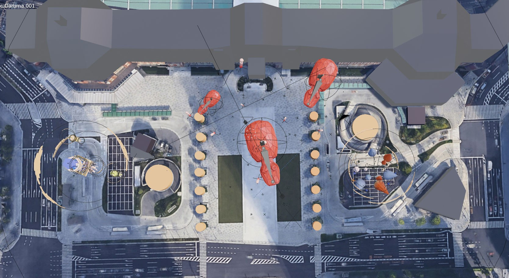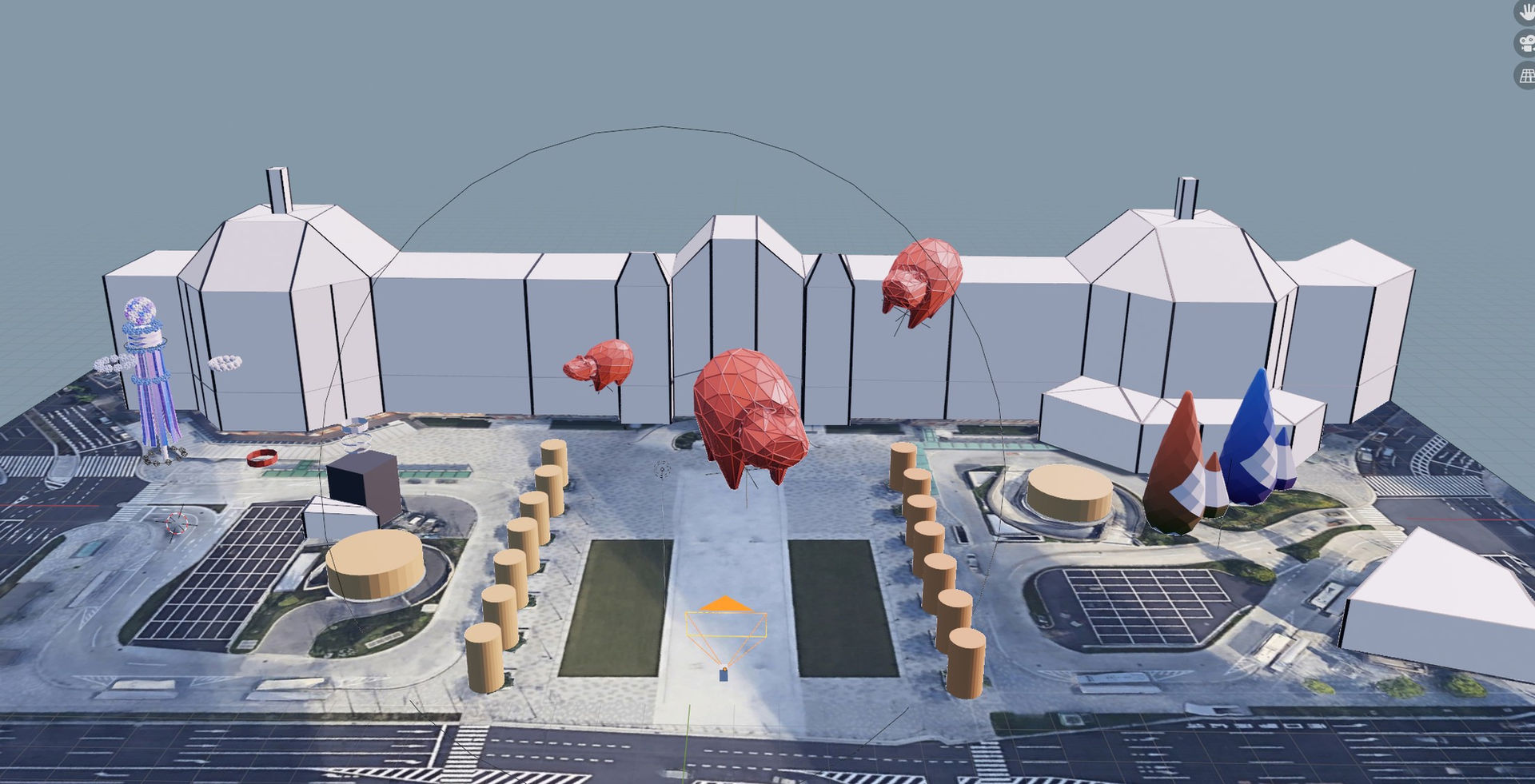The situation didn't allow us to visit Tokyo, but the experience only happens when we're in Tokyo, so we built a rough 3d model of Tokyo station in Blender using Google Earths image and measurement to simulate the experience.